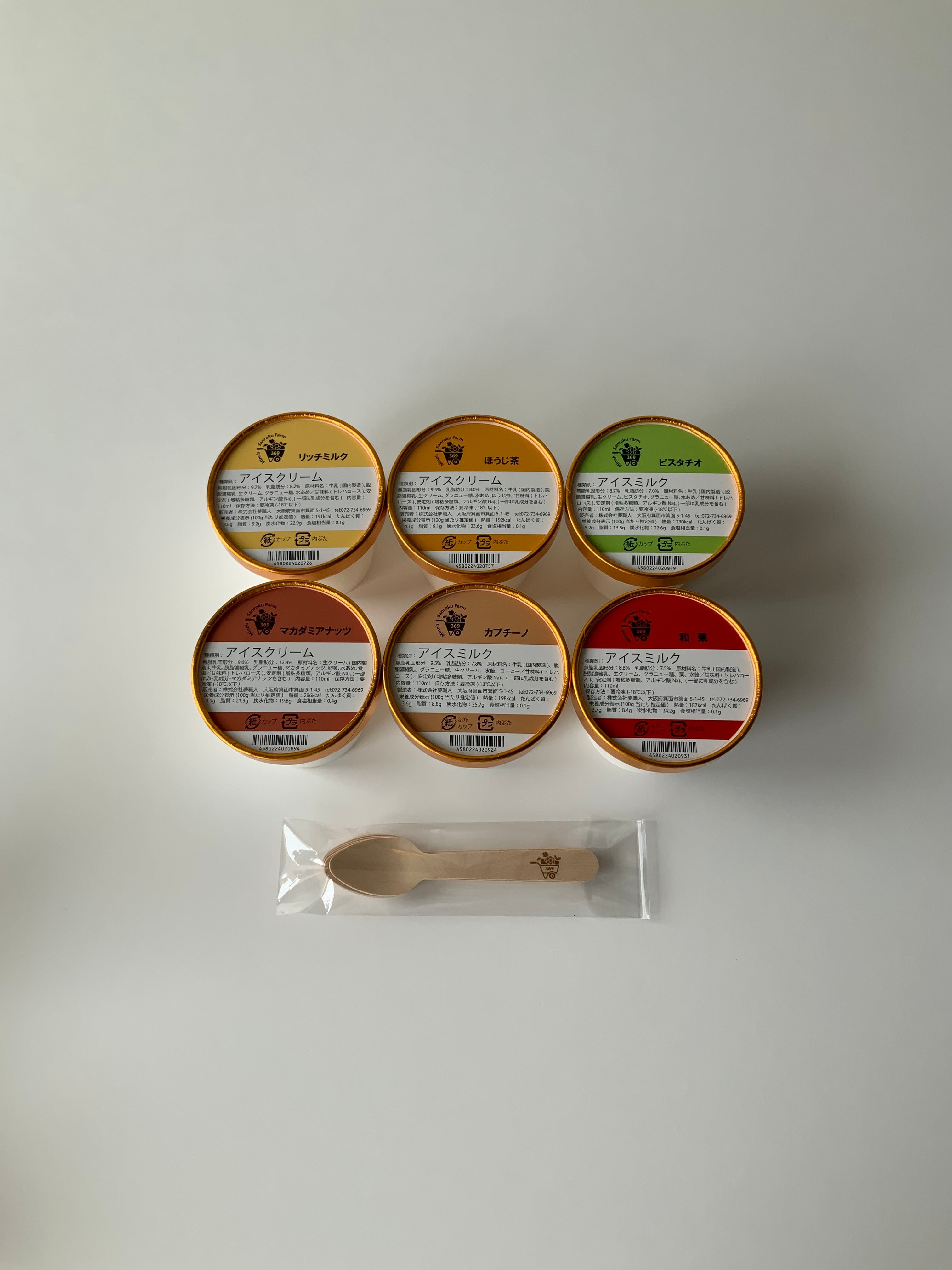 【セット内容】リッチミルク、ほうじ茶、ピスタチオ、マカダミアナッツ、カプチーノ、和栗。